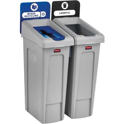 Rubbermaid Commercial Slim Jim Recycling Station 2 Stream Landfill/Mixed Recycling - Hinged Lid - Durable, Heavy Duty - Resin - Black, Blue
