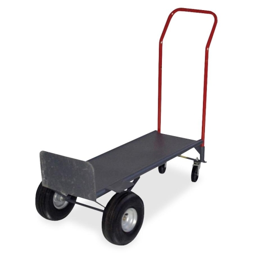 Convertible hand truck offers steel frame with a solid steel deck that prevents items from falling through. 10" pneumatic tires offer smoother transport over all terrain. Hand truck holds up to 800 lb. in two-wheel and four-wheel positions.