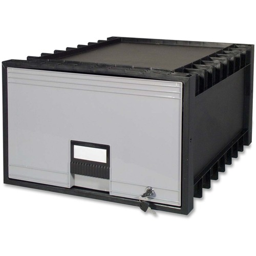 Stackable poly archive drawer will not crush or topple. Heavy-duty polypropylene construction and secure interlocking system allows stacking up to eight units high. Built-in rails hold hanging files. Drawer has built-in label holder and is moisture-resistant and mildew-resistant. Drawer rollers allow easy opening.
