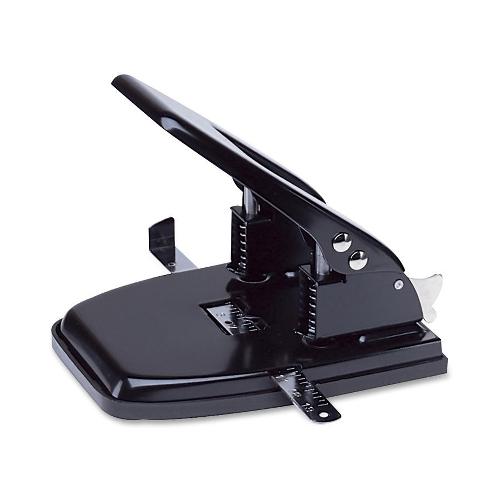 This two-hole punch drills two 1/4" holes through 24 sheets of 20 lb. paper and 30 sheets of 16 lb. paper. Includes adjustable, calibrated paper centering guide and removable chip tray.