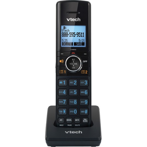 Two-line accessory handset features DECT 6.0 technology to provide a greater call range without interfering with wireless routers. Smart Call Blocker automatically blocks robocalls from ever ringing through. You can also permanently blacklist up to 1,000 names and numbers with just one touch. Two-line operation allows you to place and receive calls on two different phone lines. Full-duplex speakerphone increases participation by allowing both ends to speak and be heard at the same time for conversations that are more true to life. Caller ID allows you to see the name, number, time and date of incoming calls at a glance. Backlit keypad and display provide excellent visibility in low-light conditions. Accessory handset also includes a phonebook directory, redial, mute, voicemail waiting indicator, volume control and more. Handset is designed for the Vtech Two-Line, Two-Handset Cordless Phone (sold separately).