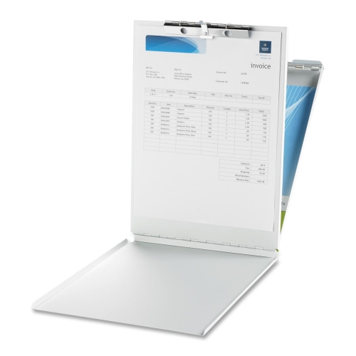 Form holder offers a top opening and sturdy anodized aluminum finish for a smooth writing surface. Interior writing plate protects documents underneath. Sturdy interior steel clip holds approximately 1/2" of forms. Storage area holds up to 30 forms.