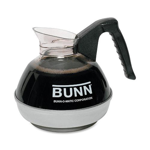 12-cup decanter features a container and handle core molded as sturdy, extra-strength, one-piece construction for long life. Clear, high-impact-resistant material complies with FDA regulations for food contact. Drip-proof, fast-pour lip - an exclusive Bunn design - assures convenient serving and clean pouring from front or either side. Base is made of high-quality stainless steel. Unbreakable decanter is designed for use with Pour-O-Matic coffee brewers.