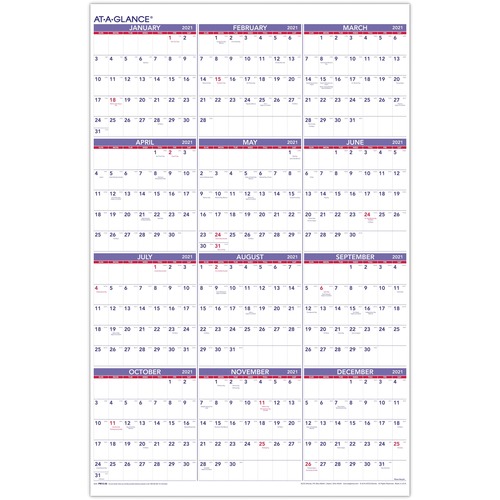 Yearly wall calendar offers a view of the entire year to track projects, schedule vacations, or just look ahead. Dated planning in quarterly rows ranges 12 months from January to December. Unruled daily blocks measure 1" x 1-1/2" and offer plenty of writing space. Federal holidays are highlighted in red. The monthly calendars also offer Sunday-through-Saturday scheduling and count of days/days remaining. Wall calendar is metalbound at top and bottom with hanging eyelet. Paper is printed in blue and red ink on quality recycled paper.
