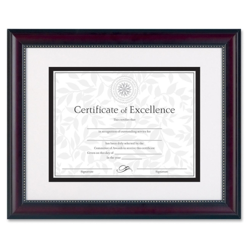 Document frame features gold-beaded accents along the frame's inner border to add an elegant touch and highlight an achievement certificate. Design also features rich tones, a clear glass front and easel back for desktop display. Hang vertically or horizontally. Document frame includes an ivory bevel matte for 8-1/2" x 11" documents and a certificate.