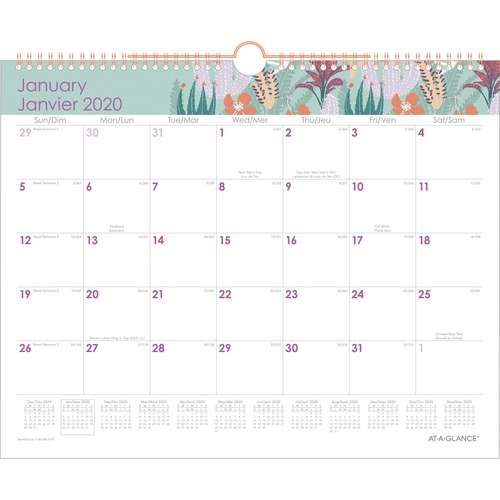 Wild Cactus Wall Calendar features a beautiful floral design on each page and a spacious monthly bilingual grid for posting reminders and deadlines. Dated pages range 12 months from January to December. Each monthly page includes ruled daily blocks from Sunday to Saturday, count of days/days remaining, holidays and a full-year reference calendar along the bottom of each page. Improved paper resists ink bleed. Use the eyelet in the gold twin-wire binding for durable hanging.