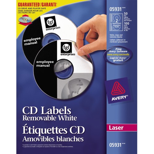 Matte White Removable CD Labels are designed to stick, stay put and come off cleanly. They're ideal for cataloging your music collection or organizing the CD-ROMs in your office. Create custom labels using Avery Design and Print Online and then print the results from your laser printer. Use the Avery Applicator (not included) to apply the labels with expert precision, and you're done. Removable labels make it easy to update titles on CD-RW discs.