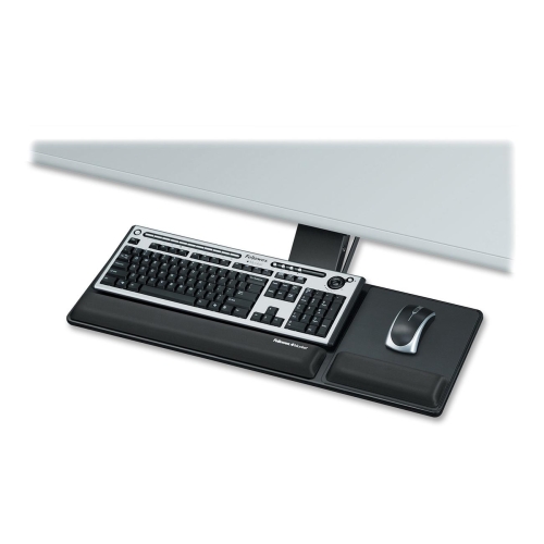 Compact keyboard tray is fully adjustable to work well in smaller work spaces. Loosen single knob to adjust tray height and tilt (negative 10 degrees), and then retighten knob to lock in position. Keyboard tray swivels 360 degrees and adjusts in height from 4-1/4" below track to 1-1/4" above track. Warning Trak helps prevent the mouse from sliding off the mousing platform. Soothing memory foam places the hand/wrist in a neutral position and features Microban antimicrobial protection so the keyboard tray stays cleaner. Standard 19" x 9-1/2" platform accommodates right-handed and left-handed mousing. Track length is 17-5/16".