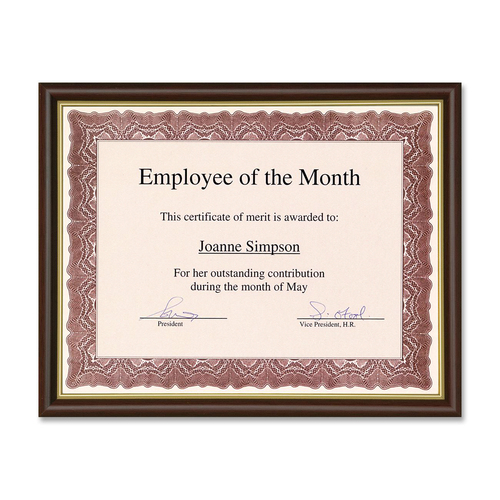 Recognition certificate frame can hang on the wall or be displayed on your tabletop, in either portrait or landscape orientation. Frame is designed for use with all 8-1/2" x 11" documents (sold separately). Certificate frame is the perfect way to help make your certificate a treasured keepsake.