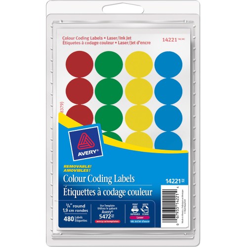 Avery® Color Coded Label - Removable Adhesive Length - Circle - Laser, Inkjet - Assorted - 288 / Box