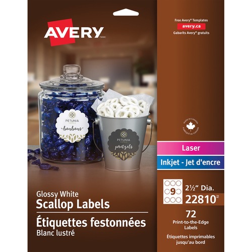 Avery® Scallop Glossy Round Labels - Permanent Adhesive - 2 1/2" Diameter - Round Scallop - Laser, Inkjet - Glossy White - 9 / Sheet - 8 Total Sheets - 72 / Pack