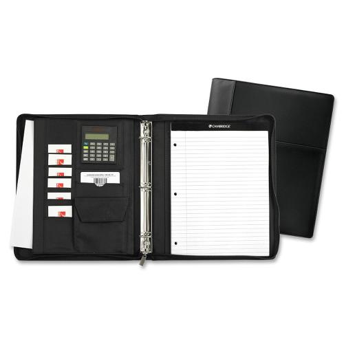 Microfibre 1" Zip Binder features a sleek design and smart functionality while keeping everything you need zipped up in one place. Binder is made of sturdy, water-resistant microfibre material with leatherlike kidskin spine for long life. Design provides an expanding interior pocket, business/credit card pockets, mesh pocket for cell phone or PDA and pen loop. Binder includes a multifunction calculator and letter-size perforated, three-hole punched writing pad with 40 sheets. Sheet capacity for the binder is 100 sheets.