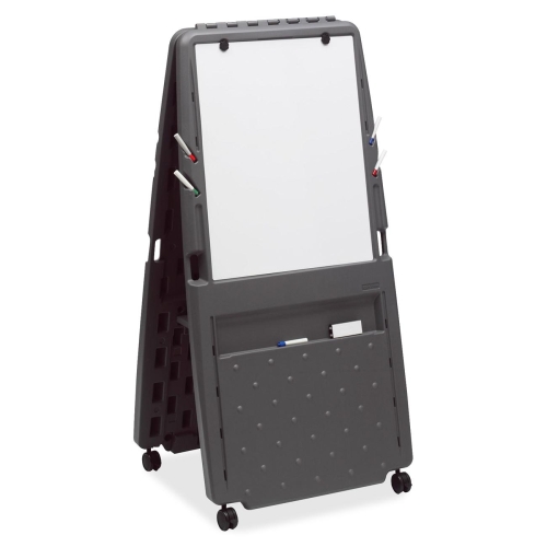 Presentation easel features a dry-erase writing surface and a place where 27" x 34" pads (sold separately) can be securely mounted to both sides of the board. Design includes gravity marker retention slots so markers (sold separately) are always ready for use. Use grab handles and four locking casters for easy movement and stability. Durable easel body is made of blow-molded, high-density polyethylene that is dent-resistant and scratch-resistant. Lightweight easel is washable and weighs 54 lb.