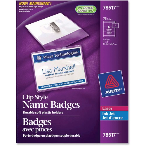 Create professional-looking name badges instantly with this easy-to-use kit. Garment-friendly clip provides a hands-free way to present your name and information at meetings, seminars, parties and more. Soft, PVC-free badge holders provide flexibility and easy readability. Name badges are compatible with laser and inkjet printers (each sold separately).